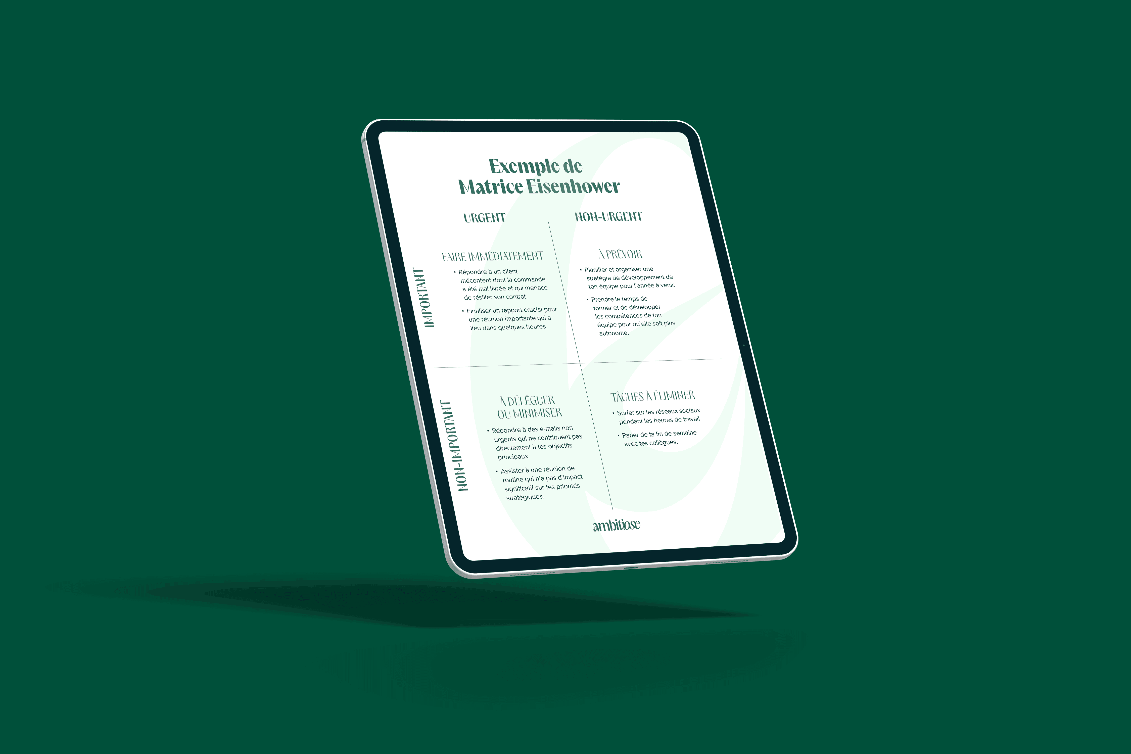 L’outil s’appuie sur la matrice Eisenhower, avec des explications claires et des exemples concrets pour t’aider à l’utiliser dans ta réalité de gestion